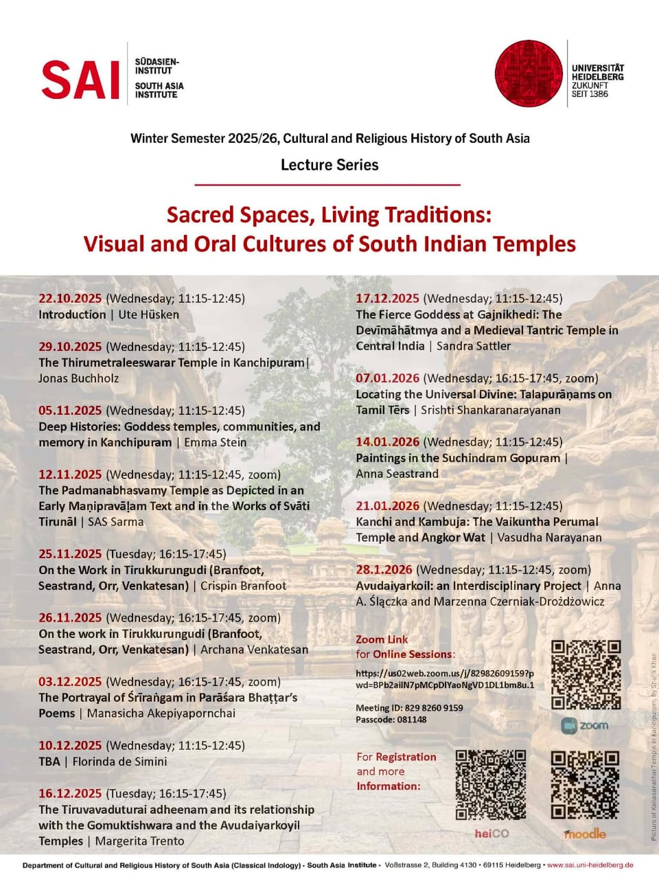 Winter term's lecture series "Sacred Spaces, Living Traditions: Visual and Oral Cultures of South Indian Temples" at the University of Heidelberg - with many eminent scholars presenting their research.