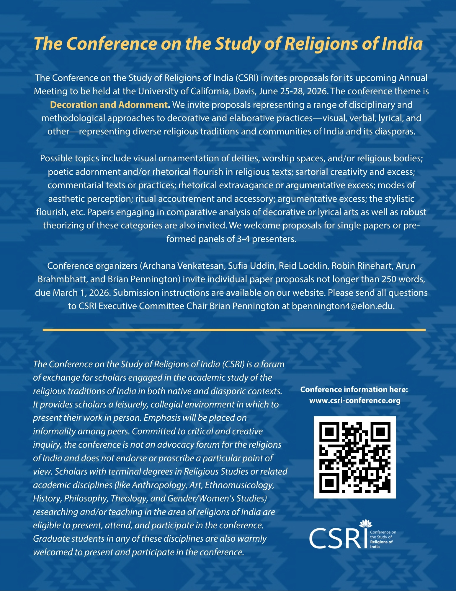 [INDOLOGY] Deadline March 1 || Conference for the Study or Religion in India | UC Davis | June 2026