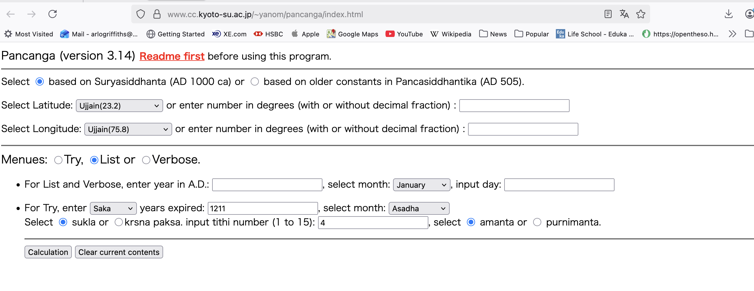 It seems that pancanga (https://www.cc.kyoto-su.ac.jp/~yanom/pancanga/index.html) is currently down. A random query yields the result "ERROR: What should I calculate".